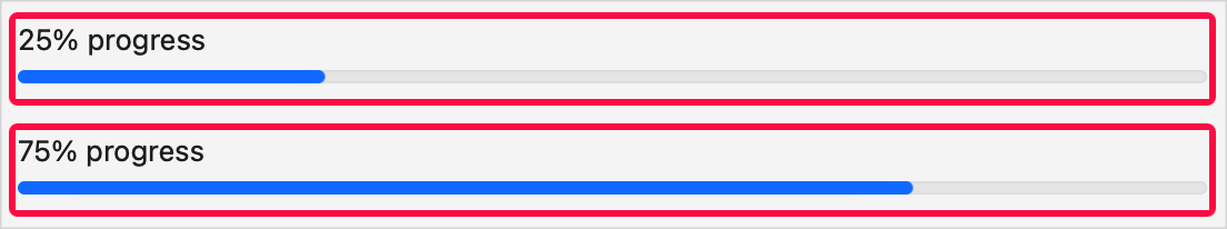 ProgressViewStyle プロトコルに準拠するスタイルを作成することにより、進捗ビューの外観と相互作用をカスタマイズできます。ビュー内のすべての進捗ビューインスタンスに特定のスタイルを設定するには、 progressViewStyle(_:) 修飾子を使用します。以下の例では、カスタムスタイルにより、囲んでいる VStack 内のすべての進捗ビューに丸みを帯びたピンクの境界線が追加されます。