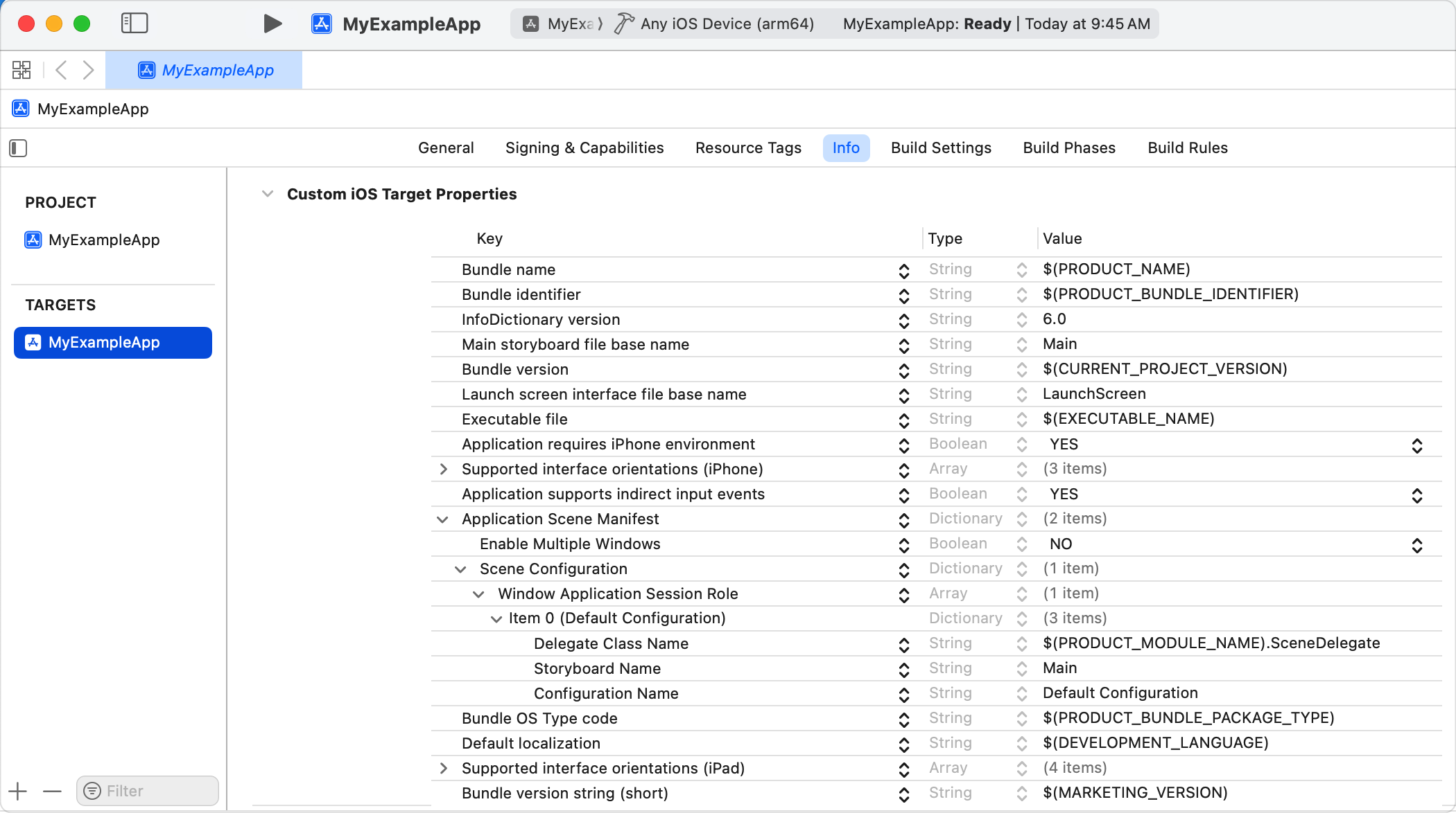 この図は、これらのキーを削除する前の Info.plist ファイルの構造を示しています。