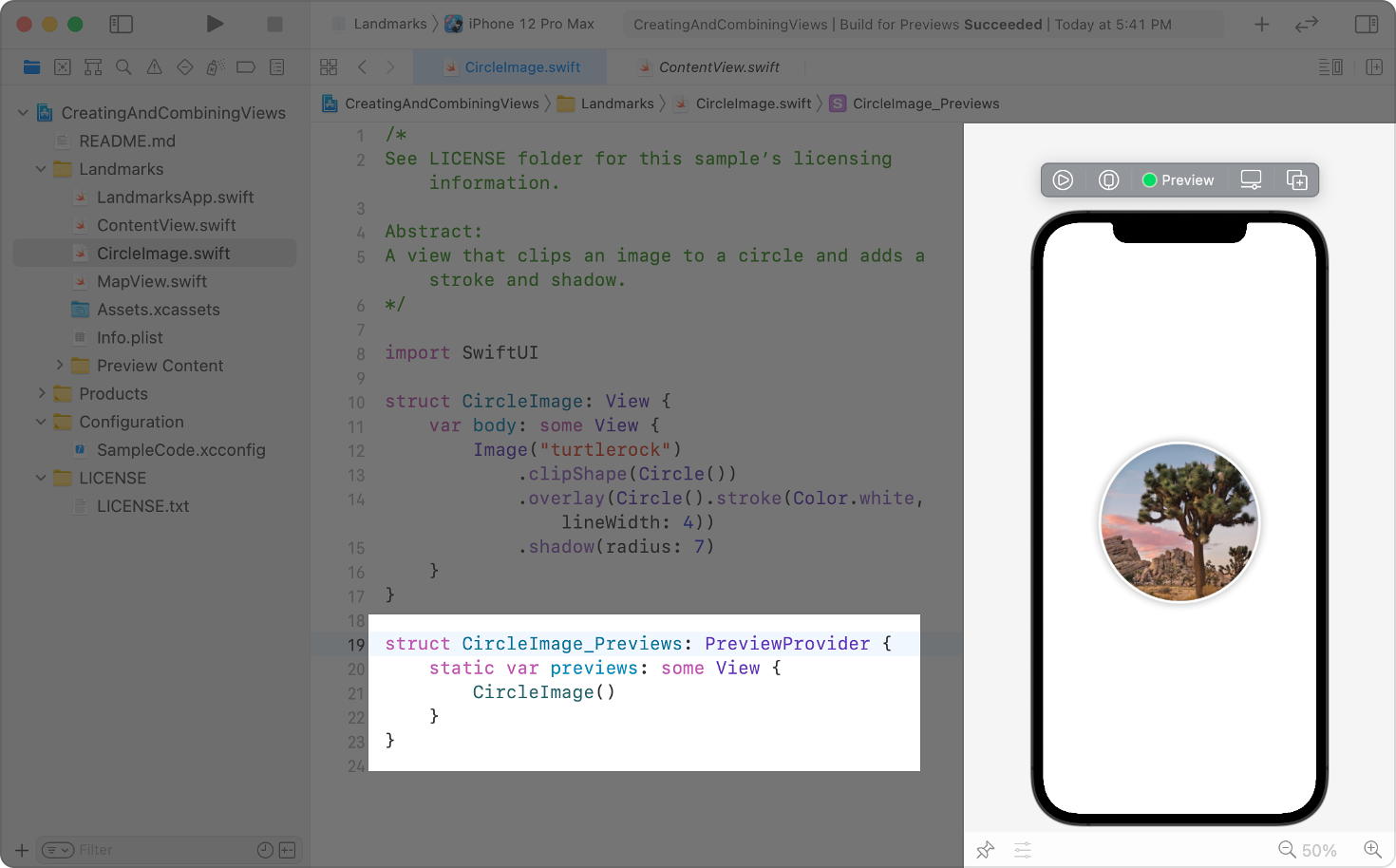 SwiftUI を使用してカスタムの View を作成すると、Xcode は、ビューのコードに変更を加えても最新の状態に保たれるビューのコンテンツのプレビューを表示できます。何を表示するかを Xcode に指示するために、PreviewProvider プロトコルに準拠する構造体を定義して下さい。Xcode は、コードの脇にあるキャンバスにプレビューを表示します。