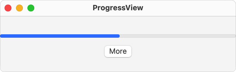以下の例では、状態プロパティの progress (進行状況) を使用して、確定した ProgressView に進行状況を表示します。進行状況ビューはデフォルトの合計 1.0 を使用し、progress は初期値 0.5 で始まるため、進行状況ビューは半分完了した状態から始まります。進行状況ビューの下にある [More(その他)] ボタンを使用すると、ユーザは進行状況を 5% ずつ増やすことができます。